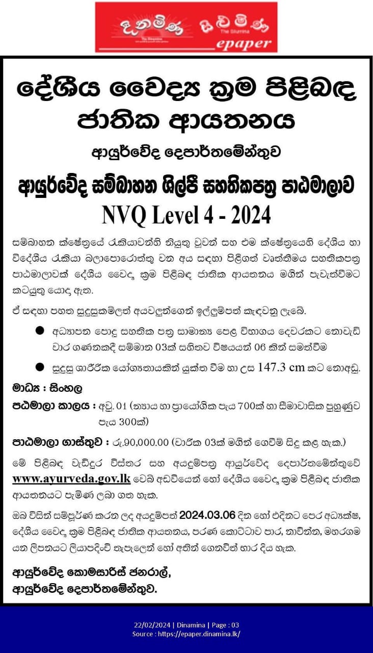 Ayurvedic Massage Therapist Certificate Course 2024 ( NVQ Level 4
