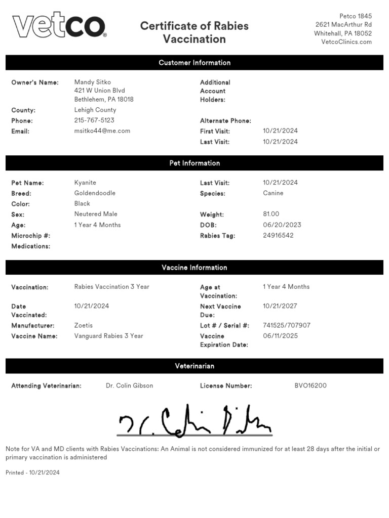 Rabies Vaccine Certificate