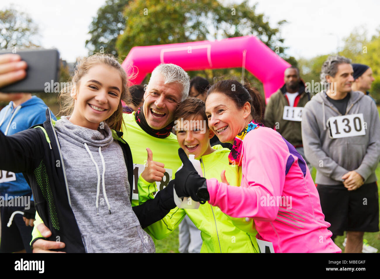 Enthusiastic family runners taking selfie at charity race Stock Photo