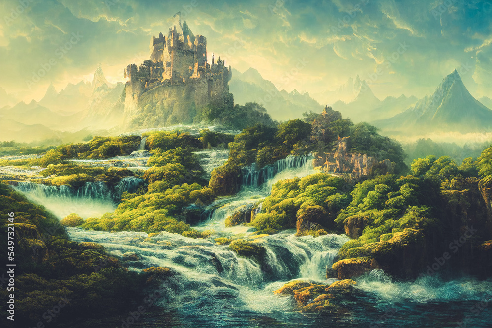 Beautiful digital art 3D illustration of fantasy fairy tale castle on