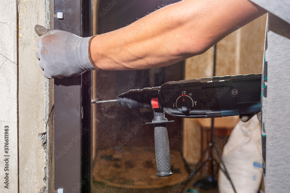 The carpenter drills holes in the wall and the metal door frame with a