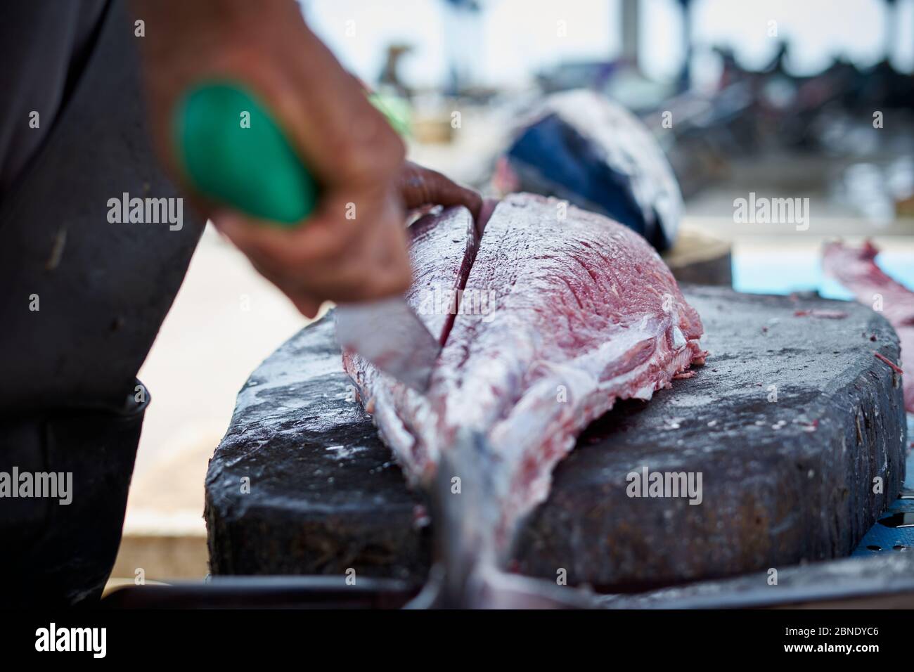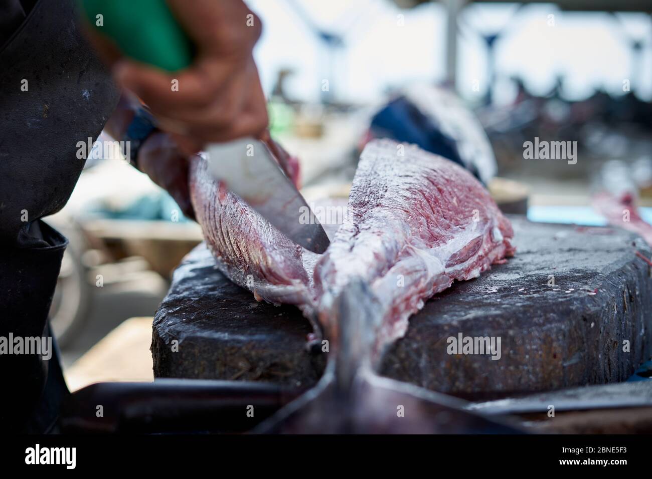 Fresh big Tuna fish cut by seafood vendor at fish market Stock Photo