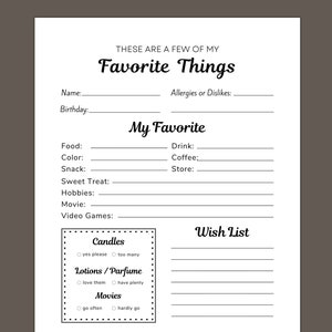 Editable My Favorite Things Printable Questionnaire wish List Survey