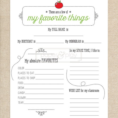 Teacher #39 s Favorite Things Printable Teacher Questionnaire Etsy