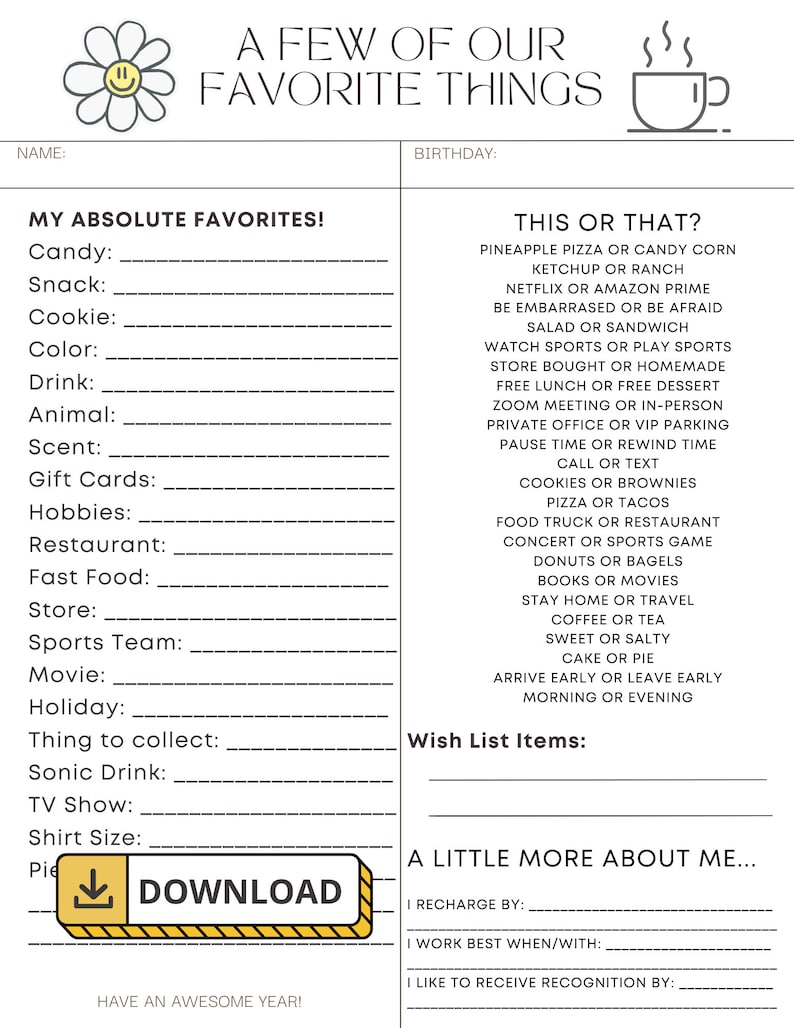 Favorite Things Questionnaire Employee