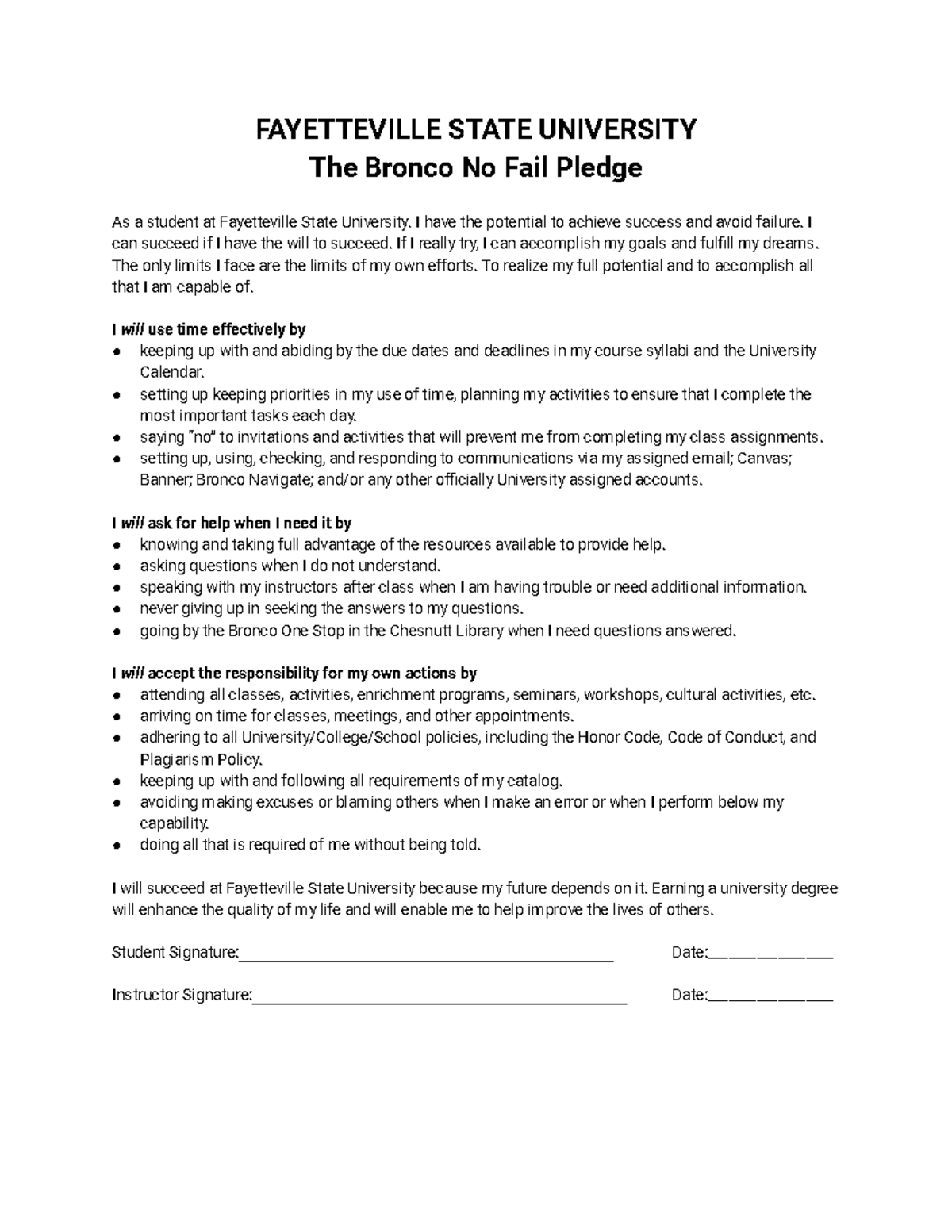 FSU No Fail Pledge pierce FAYETTEVILLE STATE UNIVERSITY The Bronco