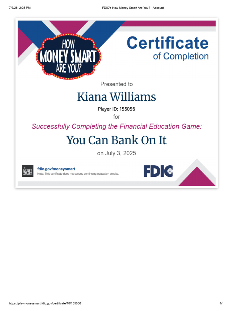 Fdic Money Smart Certificate Completion