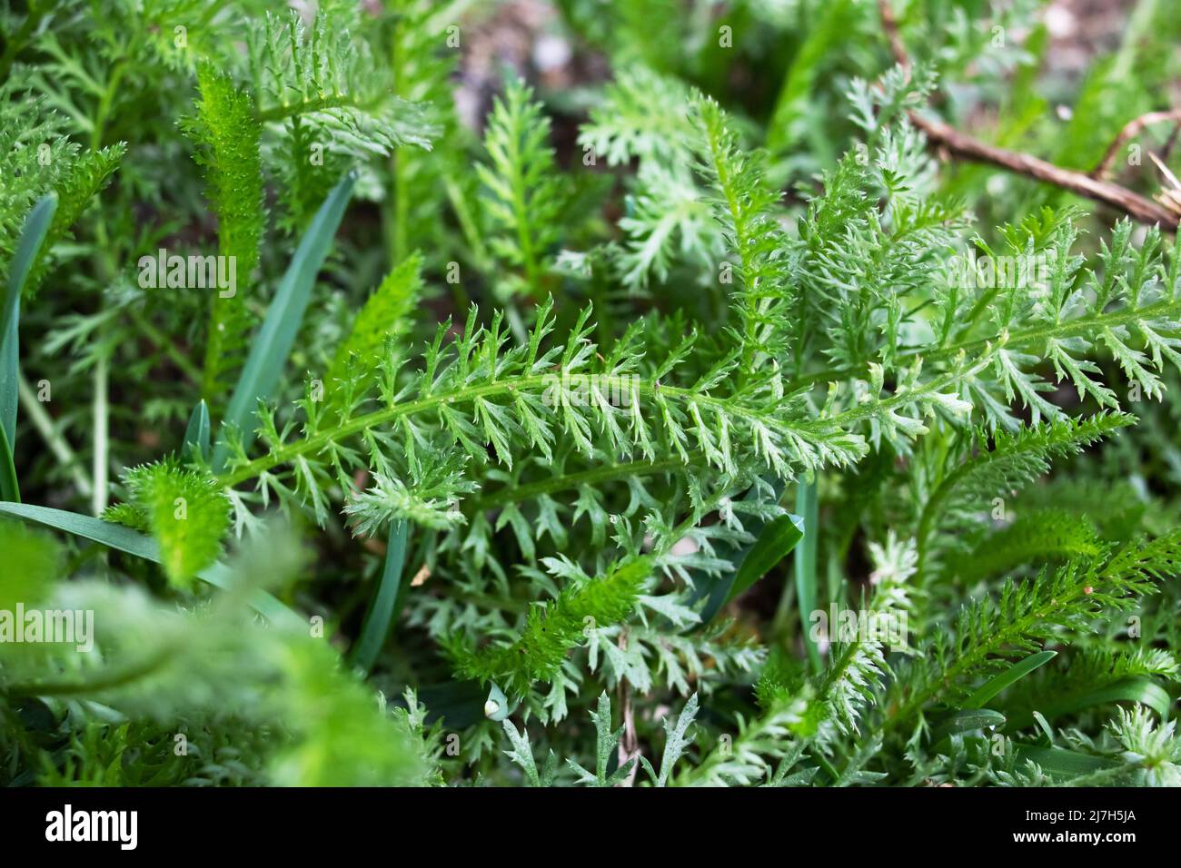 Green feathery leaves of a achillea millefolium or yarrow plant in
