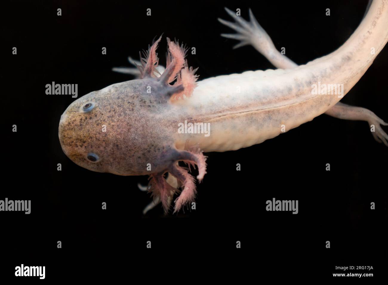 Top view closeup of grown up Mexican Axolotl salamander with feathery