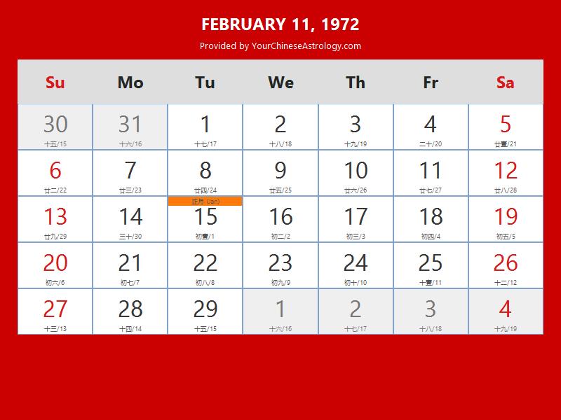 Chinese Calendar Feb 11 1972: Auspicious Things to Do and Hours Bazi