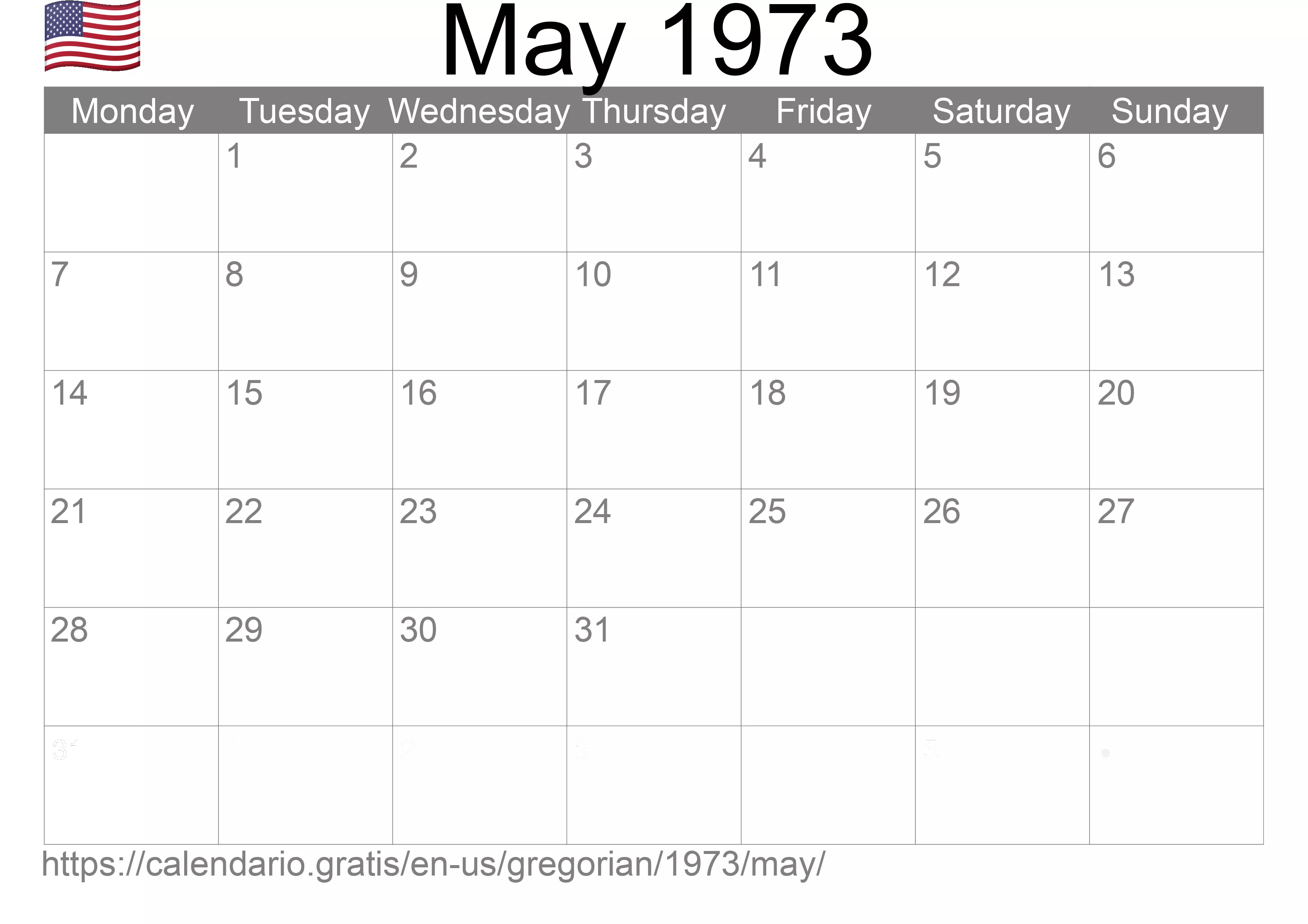 Calendar May 1973 from United States of America in English ☑️
