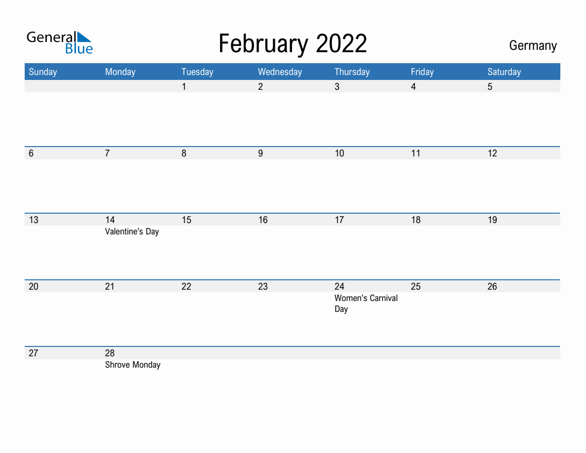 February 2022 Monthly Calendars with Germany Holidays