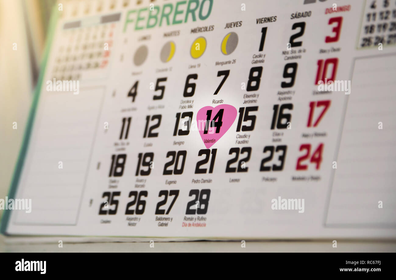 Valentines day calendar showing February 14 with red heart Stock Photo