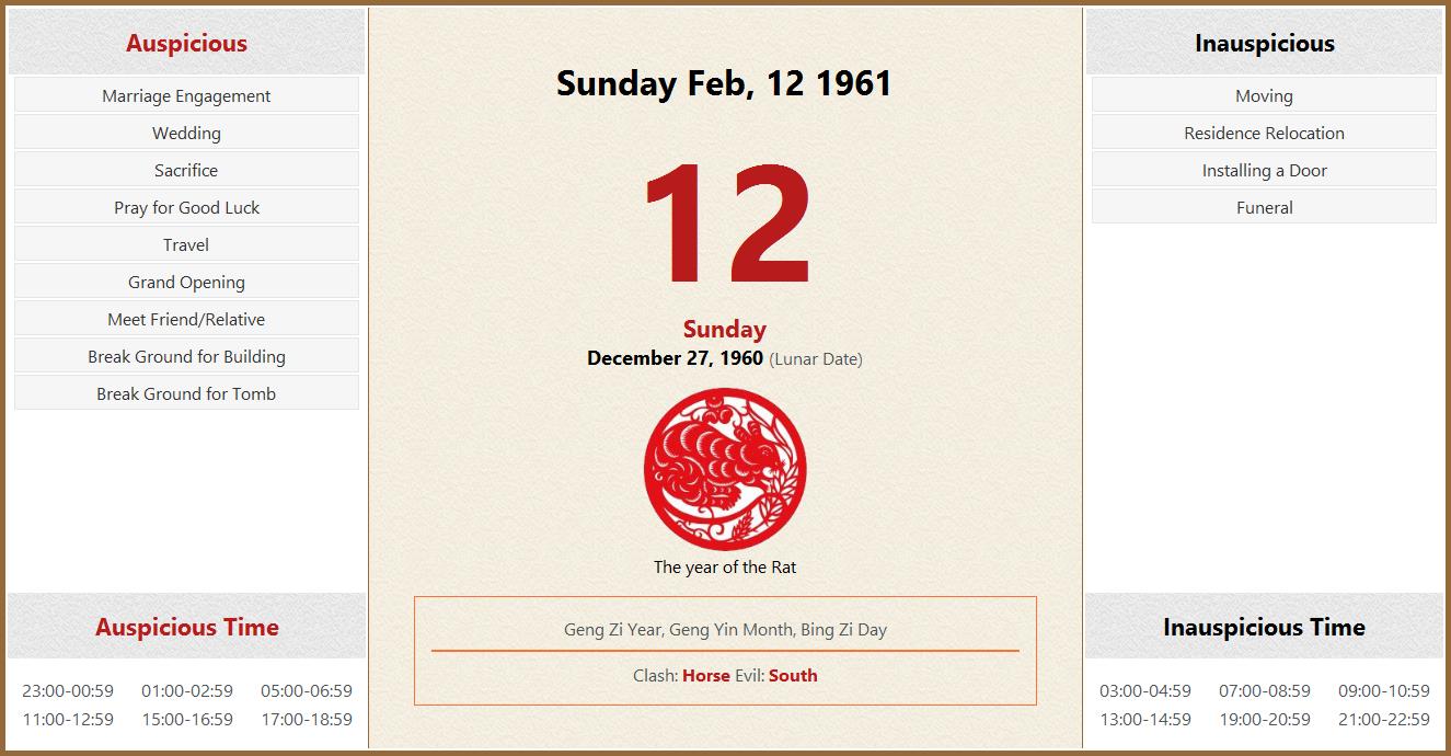February 12 1961 Almanac Calendar: Auspicious/Inauspicious Events and