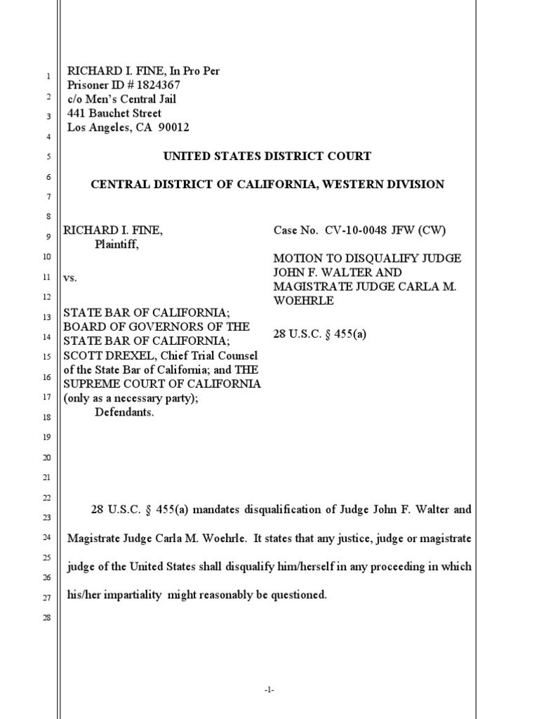 USDC DKT 4 Fine #39 s Motion To Disqualify Judges Walter Woehrle