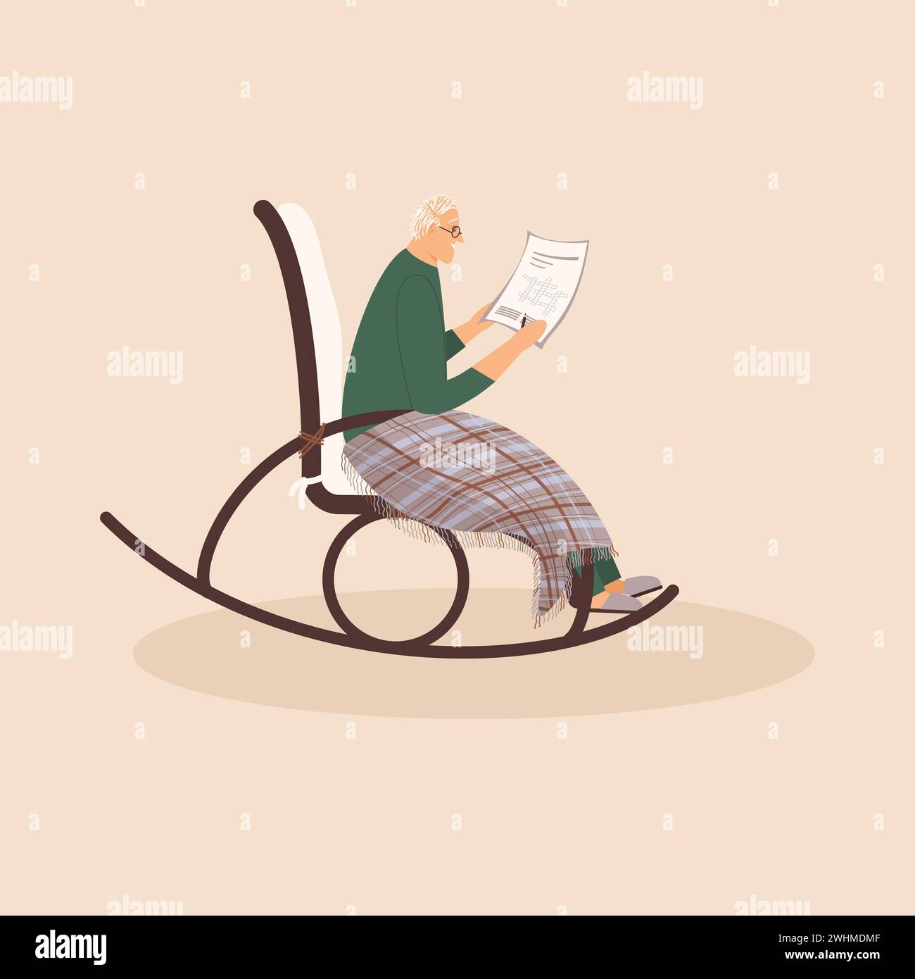 Elderly cute man is sitting in a rocking chair Old male covered his