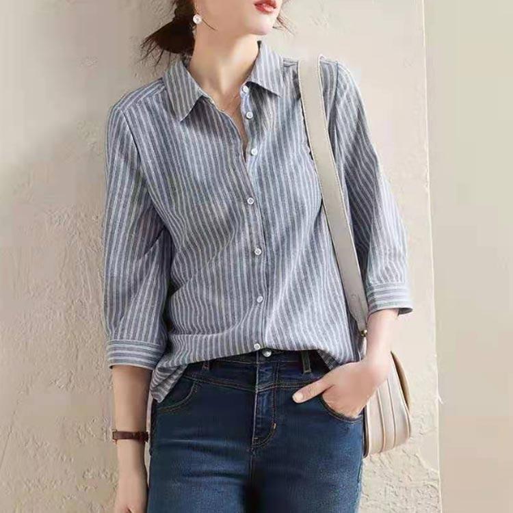 送料無料 シャツ レディース 七分袖 ブラウス とろみシャツ とろみブラウス ストライプ柄 レギュラー襟 ワイシャツ カジュアル シンプル フ