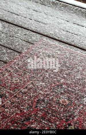 The first snow fell on the veranda of a private house Stock Photo Alamy