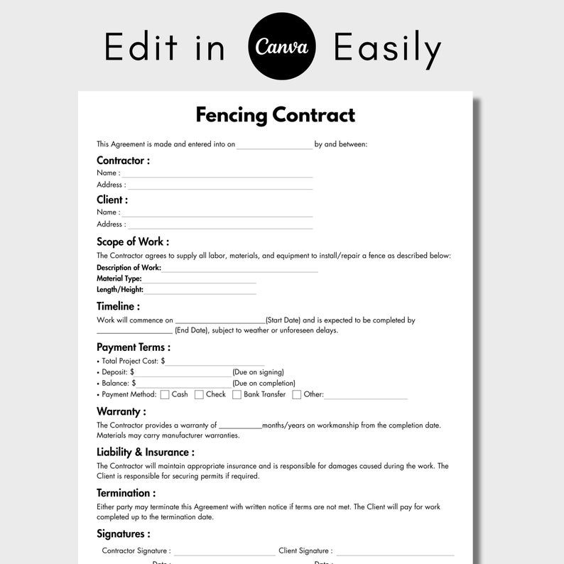 Fence Installation Contract Template PDF Download Edit in Canva Etsy