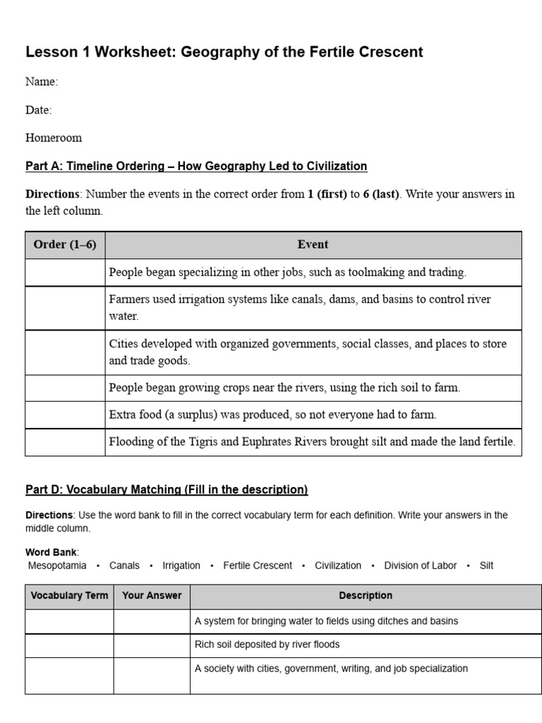 Mesopotamia Fertile Crescent Worksheet: History