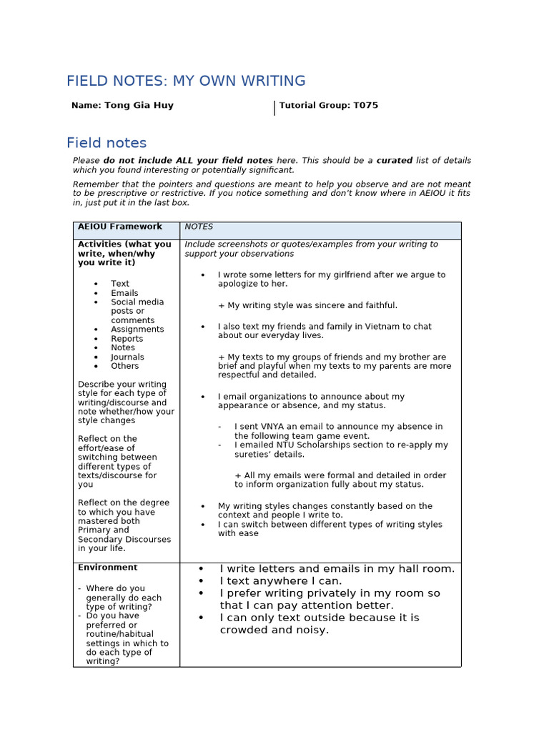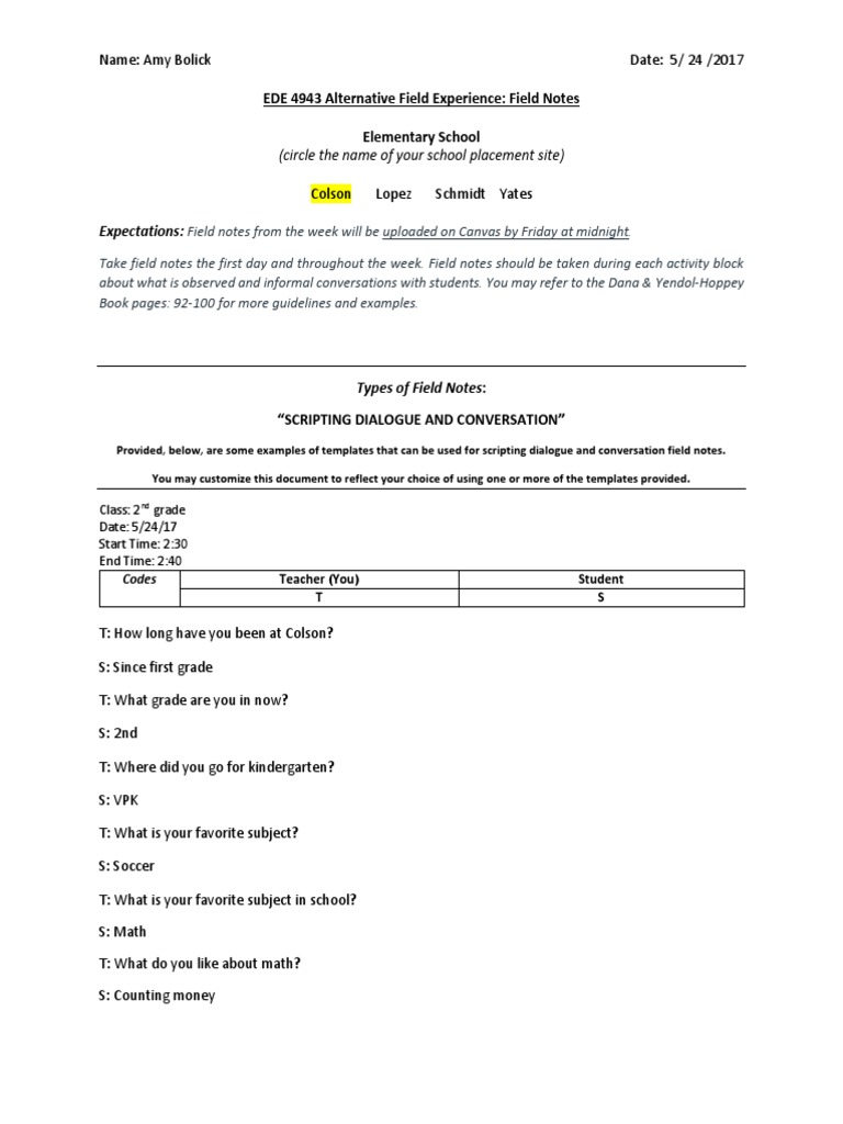 Week 2 Field Notes Template Scripting Dialogue and Conversation PDF