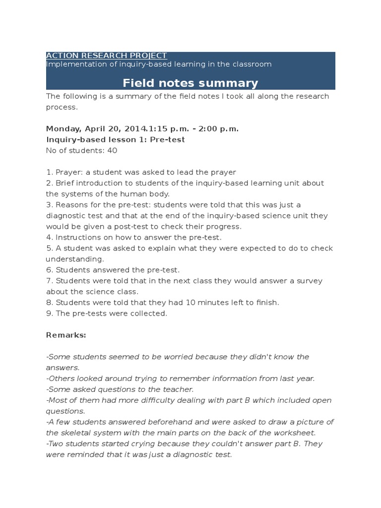 A Sample of Field Notes PDF Inquiry Based Learning Survey Methodology