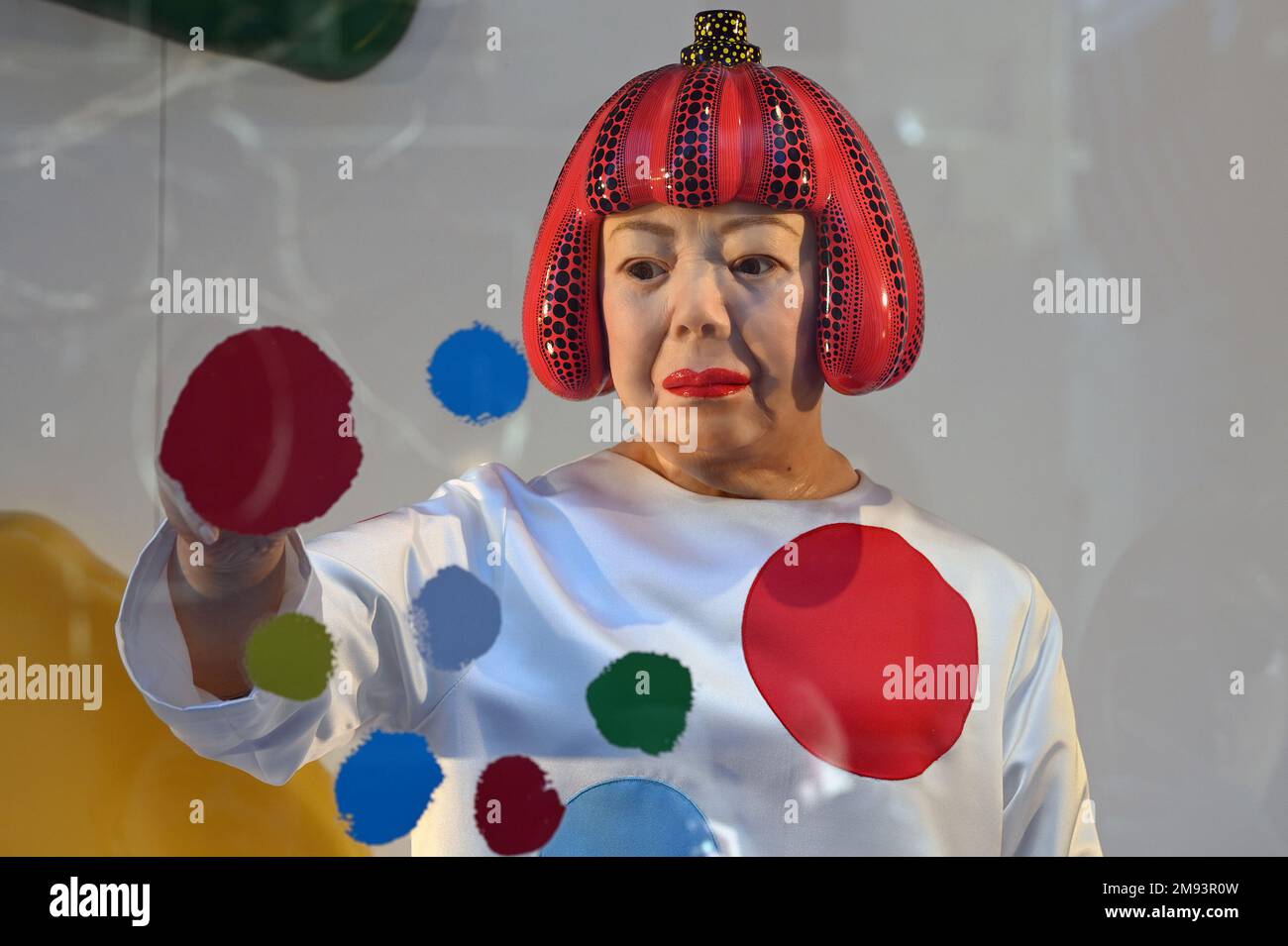 A lifelike robot of Yayoi Kusama paints spots on the window of the