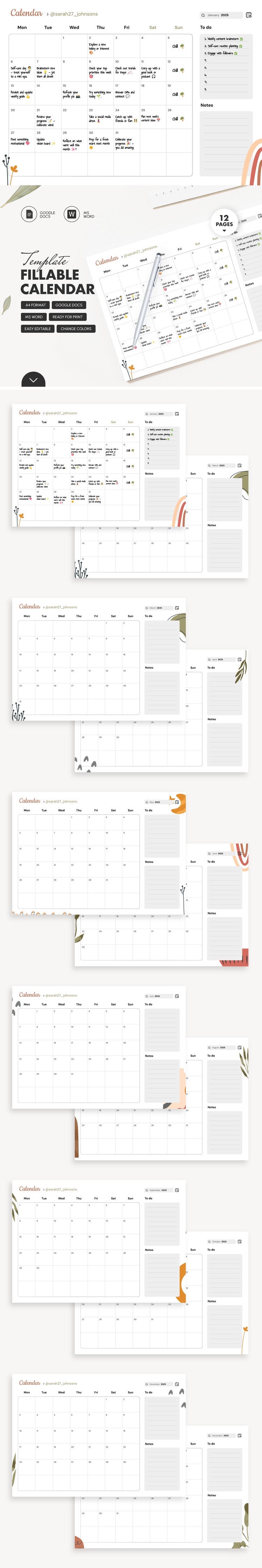 Cute Fillable 2025 Calendar Template in Google Docs and Microsoft Word