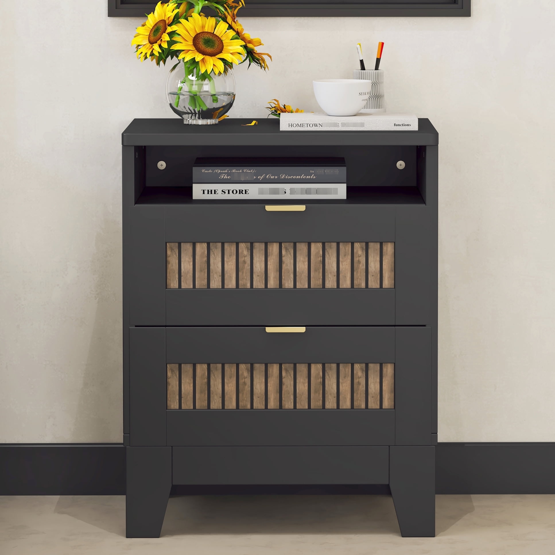 2 Wooden Nightstand With Metal Handle And Fine Strip Bedroom Implement