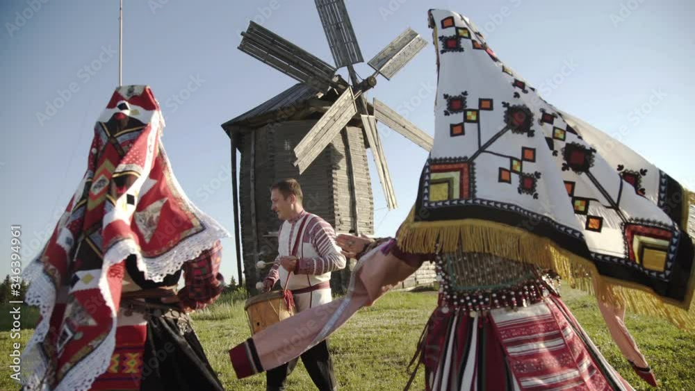 Folklore ensemble indigenous people dancing in traditional clothing