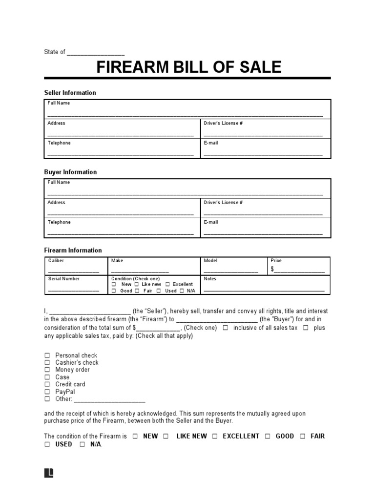 Firearm Bill of Sale Blank Printable Form Template in PDF Word