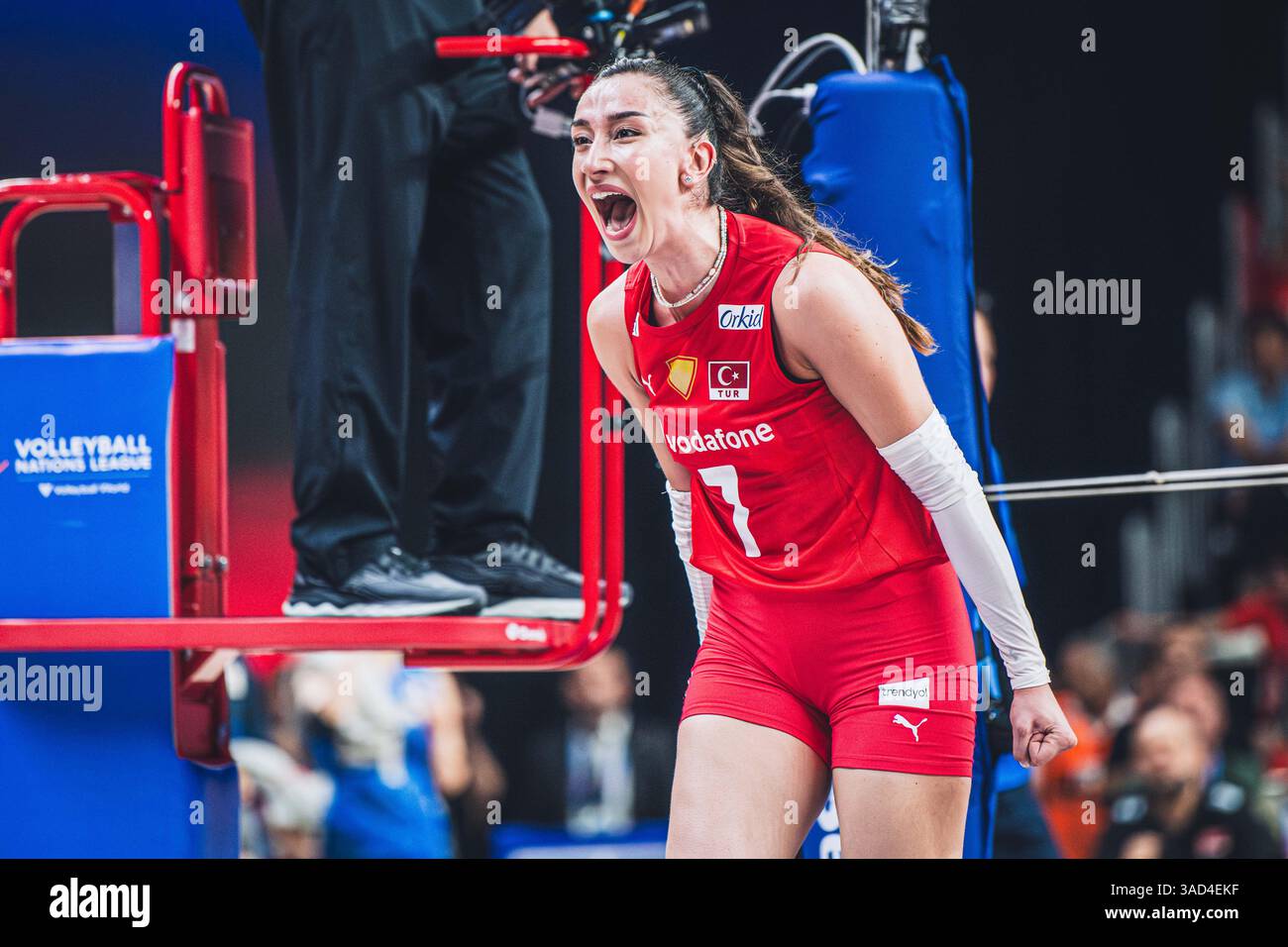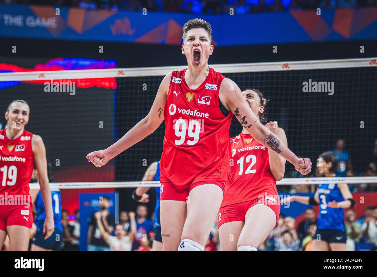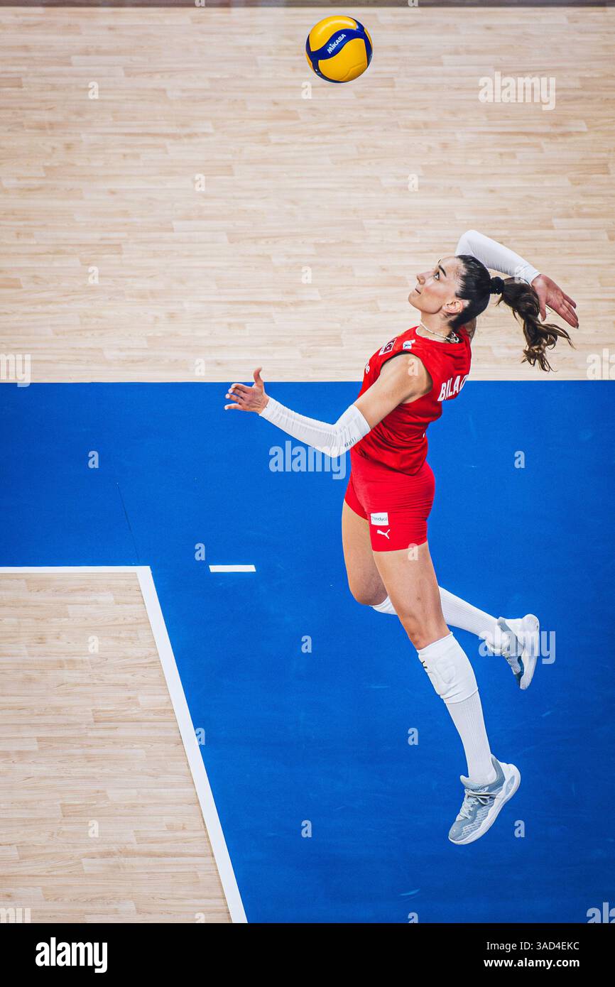 Volleyball players from Turkiye and the Japan in action during the FIVB