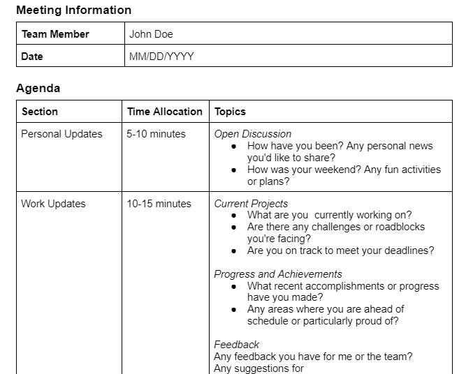 One On One Meeting: Sample Questions and 2 Best Agenda Templates