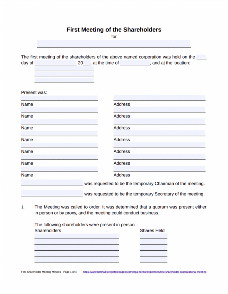 First Shareholder Meeting Minutes Template