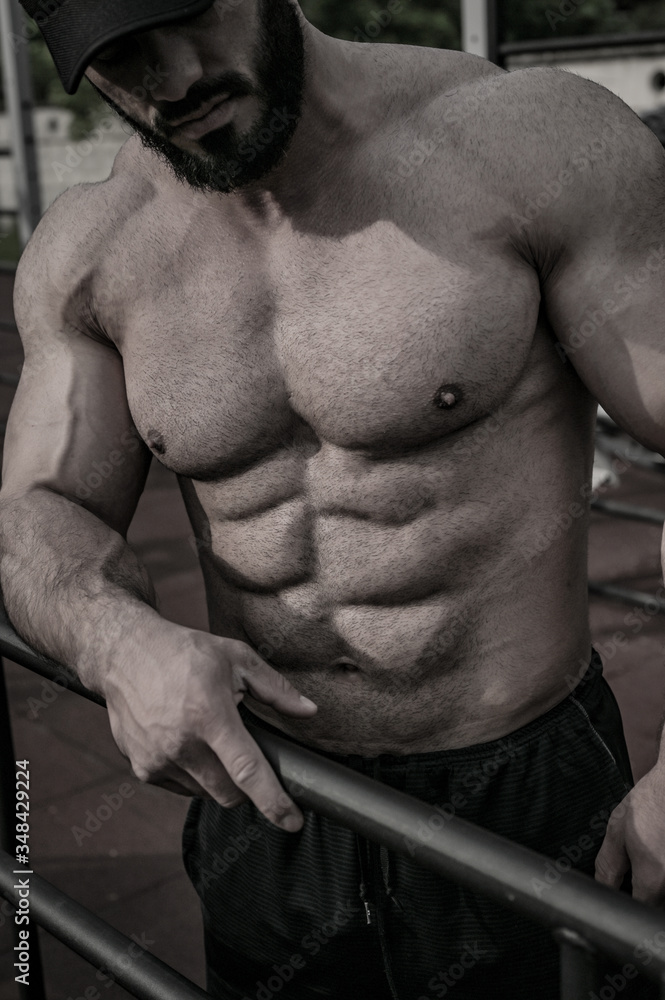 strong young male with beard and perfect fitness abdominal muscles in