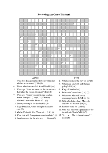 Macbeth: Printable Crossword Resource for Act 1 Teaching Resources