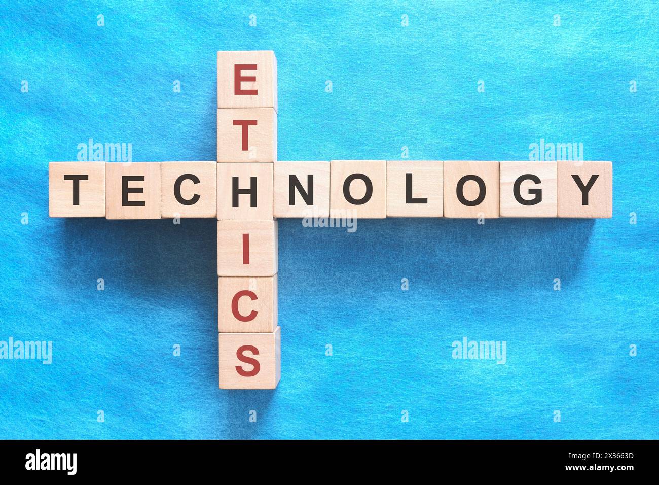Technology ethics concept Crossword puzzle flat lay in blue background