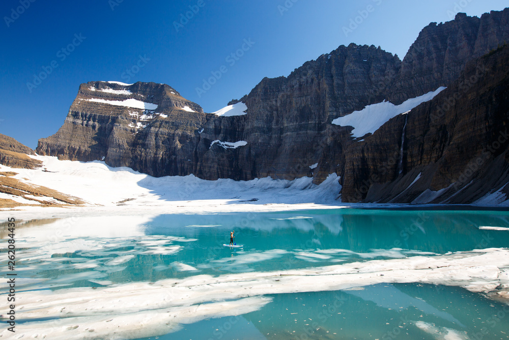 A woman stand up paddles (SUP) among floating chunks of ice on Upper