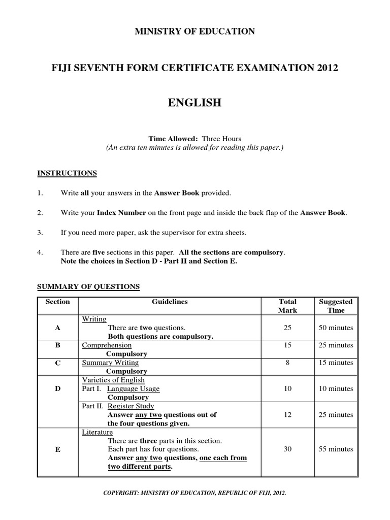 English: Fiji Seventh Form Certificate Examination 2012 PDF