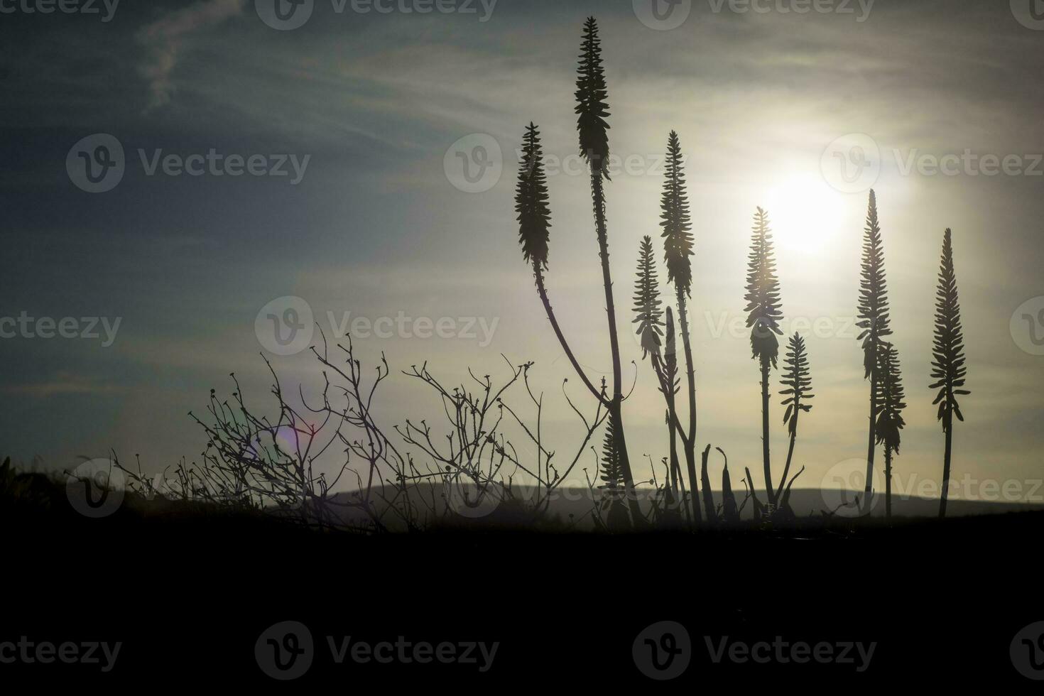 Scenic view of flowering Agave plant stem and Dracaena shrubs against
