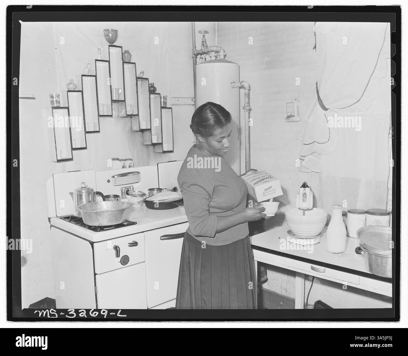 Mrs Henry Armour the wife of a coal loader is shown in her kitchen