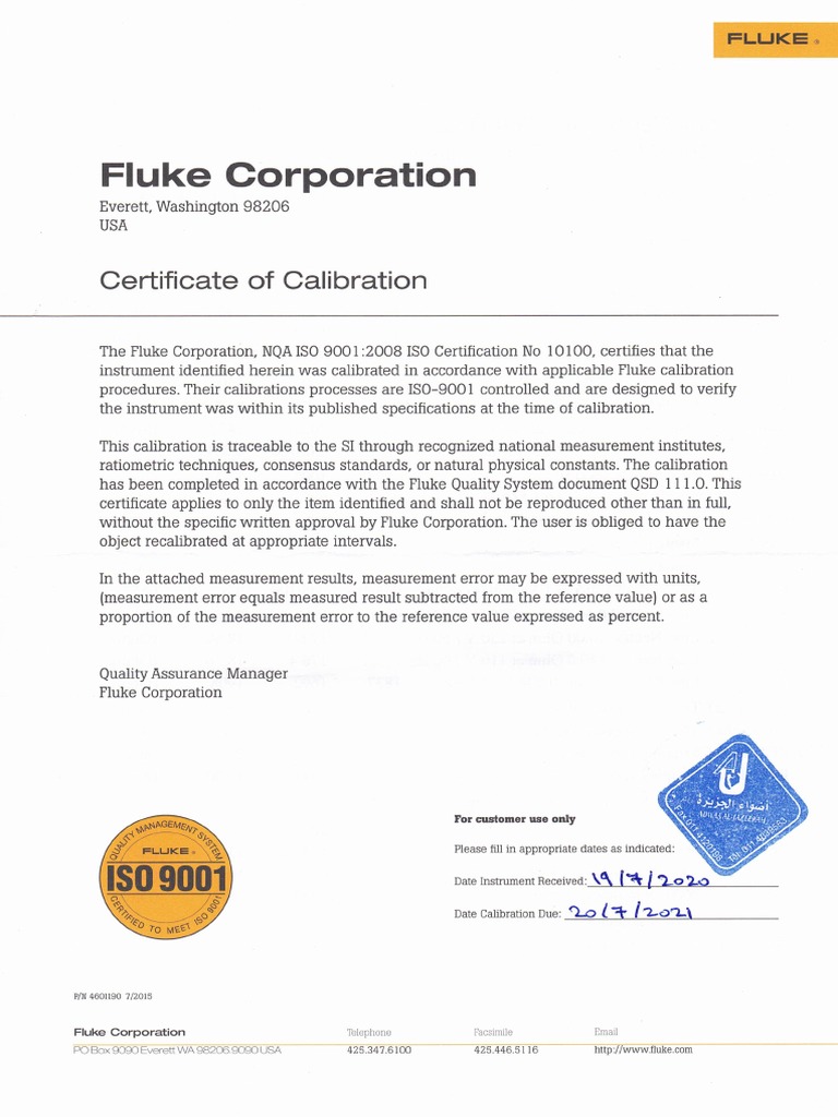 Fluke 1735 Certificate Revised PDF Calibration Electricity