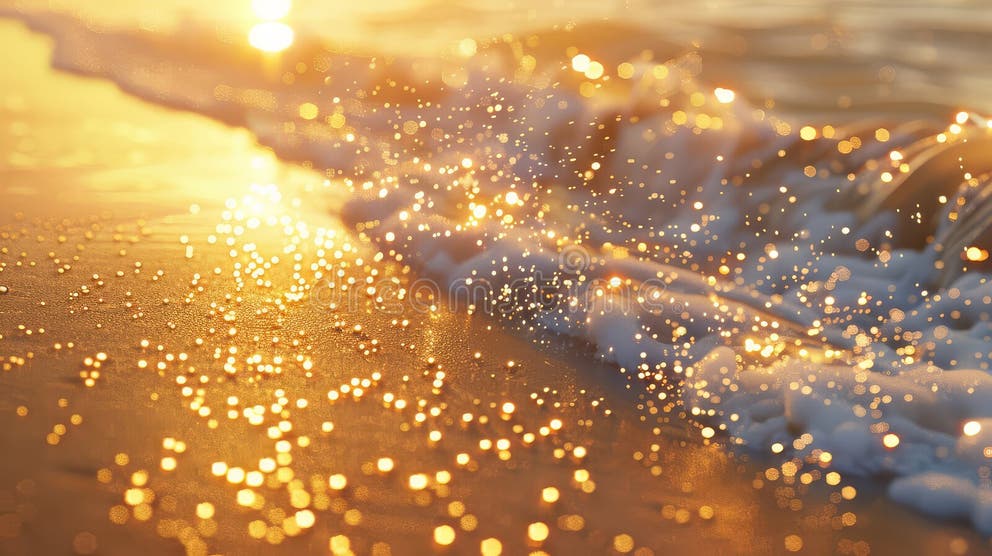 Serene Beach Scene Ocean Wave Crashing on Golden Sand at Sunset Stock