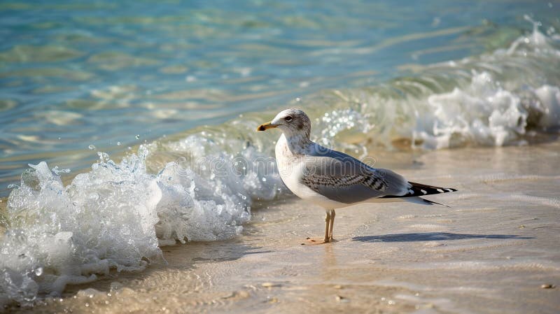Seagull on a Sandy Beach with a Foamy Wave Stock Illustration