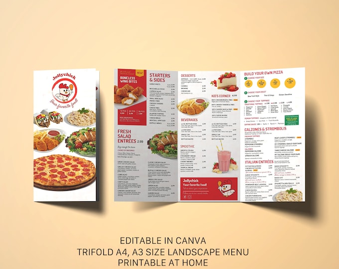 Editable Trifold Food Menu Template for Canva Vibrant and Delicious for