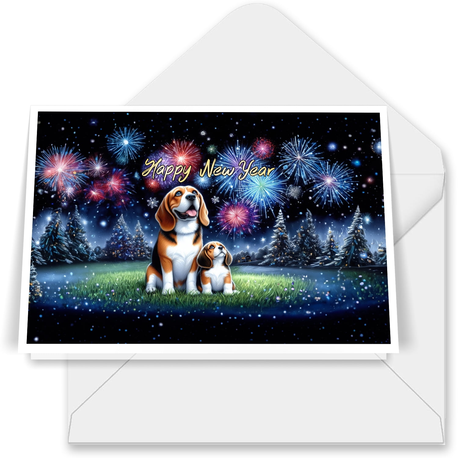 Happy New Year Beagle Family Cheer Winter Midnight Firework 7x5in