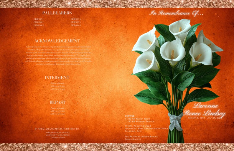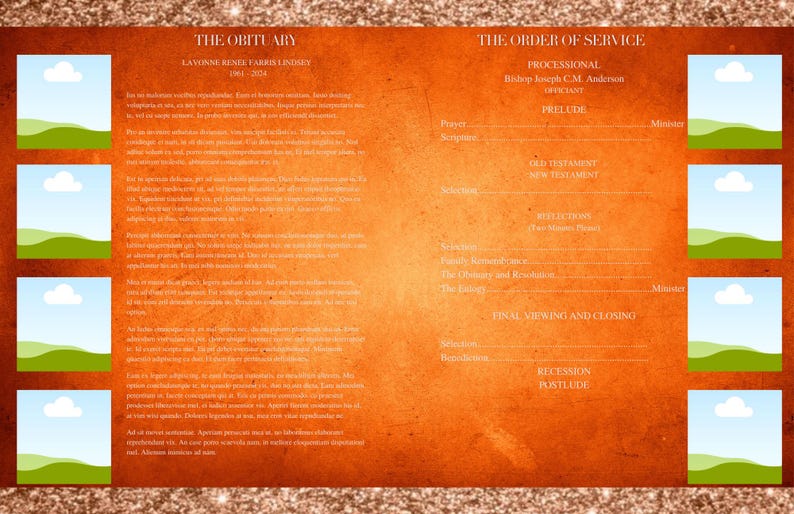 8 5x11 in Folded Funeral Program Template Orange Obituary Easy to