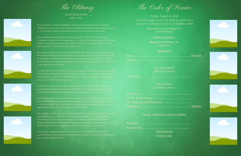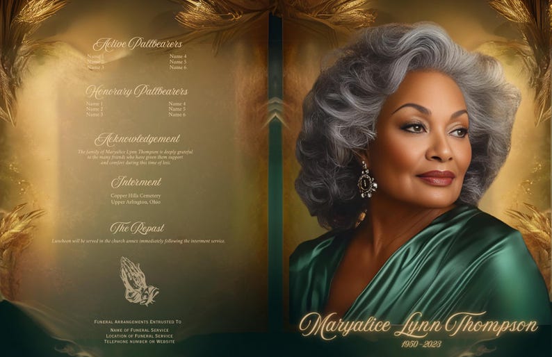 8 5x11 in Folded Funeral Program Template Green Gold Obituary Easy