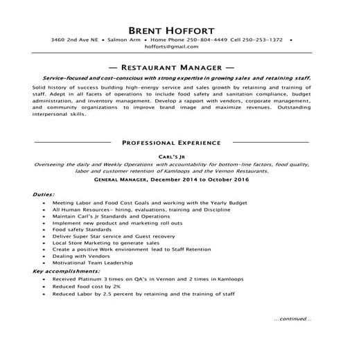 restaurant managerresume DOCX Business Administration Business