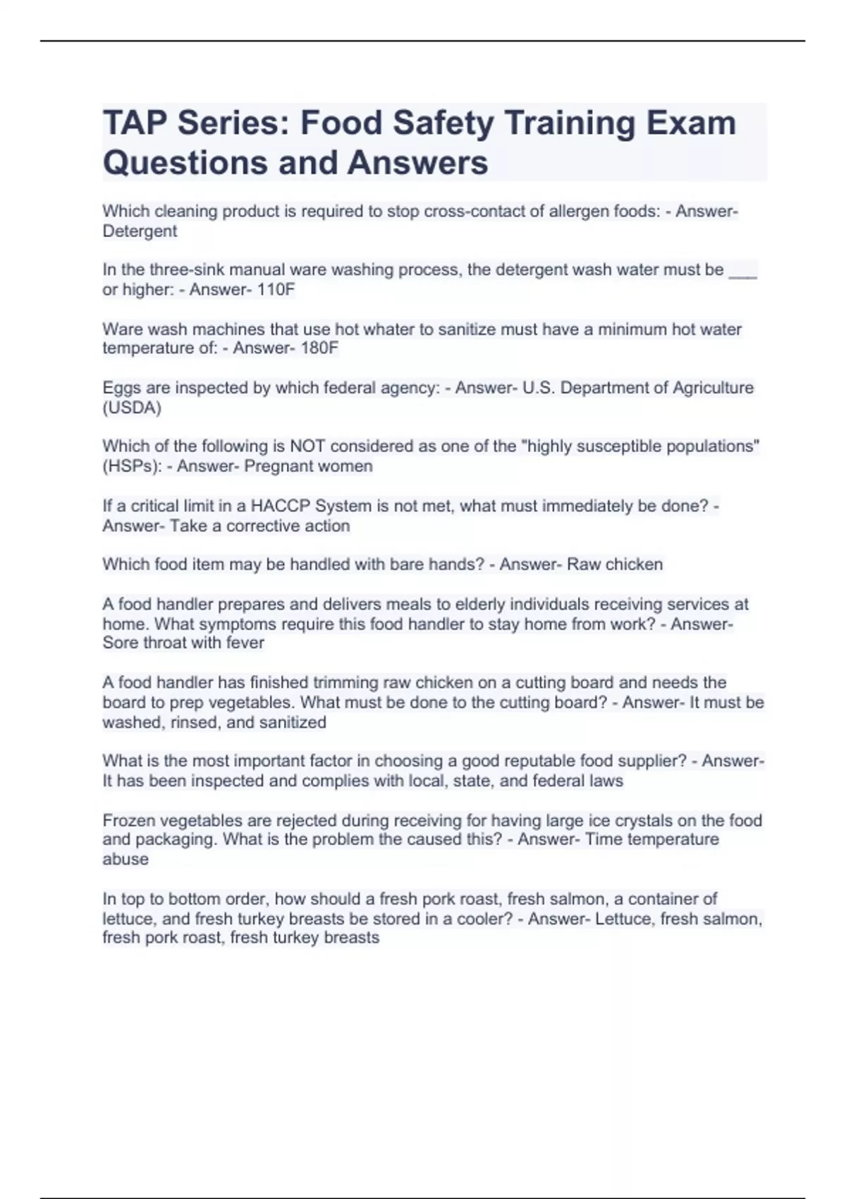 TAP Series: Food Safety Training Exam Questions and Answers TAP